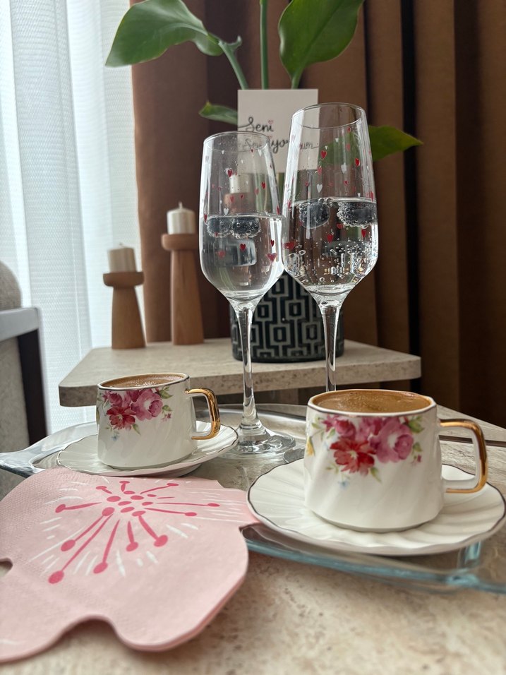Altın saplı, çiçek desenli pembe kahve fincanları ve ince desenli iki şeffaf kadeh ile servis seti. ☕ bir kere kullanıldı