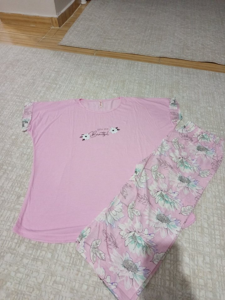 Pembe Çiçek Desenli Kısa Kollu Kadın Pijama Takımı