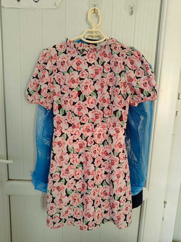 Sentetik kumaştan, kısa kollu, yüksek yakalı, drapeli ve pastel pembe çiçek desenli, vücuda oturan elbise