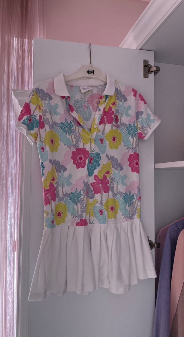 Kısa kollu, yakalı ve bol kesim kız tişörtü. Pastel çiçek desenli, etek kısmında fırfır detaylı ve sentetik kumaştan üretilmiştir. Trendy sokak stili için uygundur.