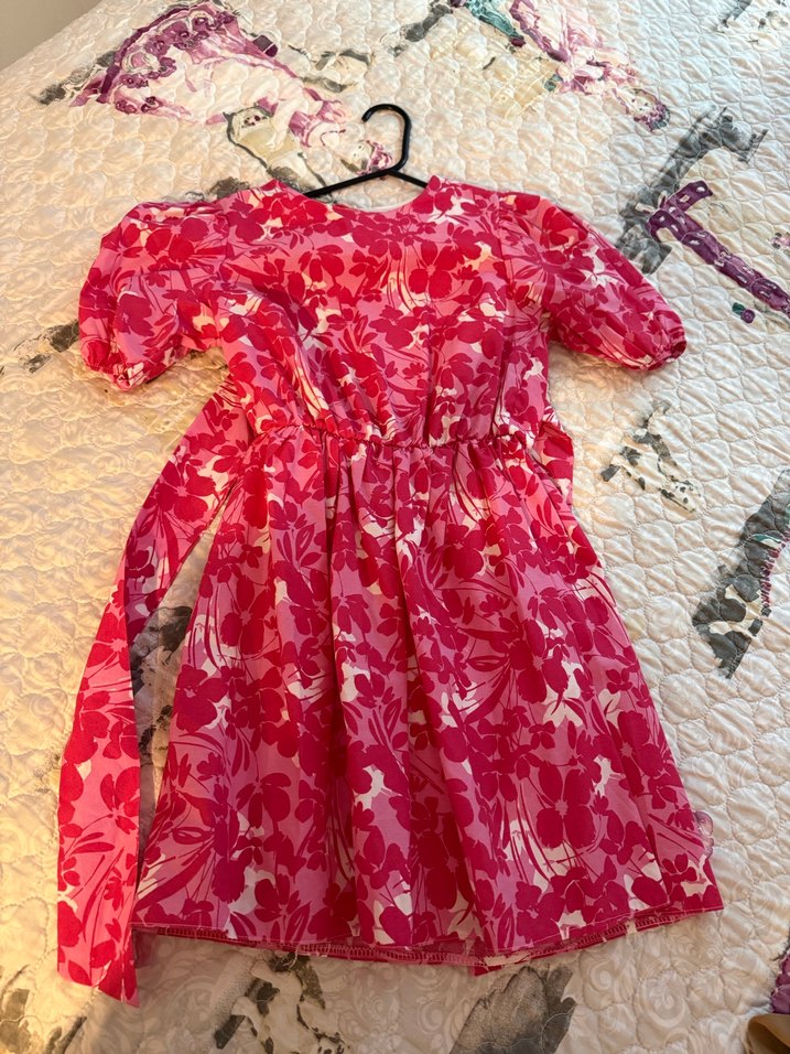 Pembe çiçek desenli, kısa kollu, bol kesim kız elbisesi. Dantel detayları ve halter yakası ile bohem tarzını yansıtır.
