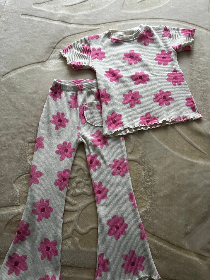 Pastel pembe çiçek desenli kısa kollu kız bebek takımı. Kumaşı yumuşak dokulu, uçlarında dantel detaylı. İspanyol paça ince bi ürün değil hafif tüylenme var. Orijinall değill