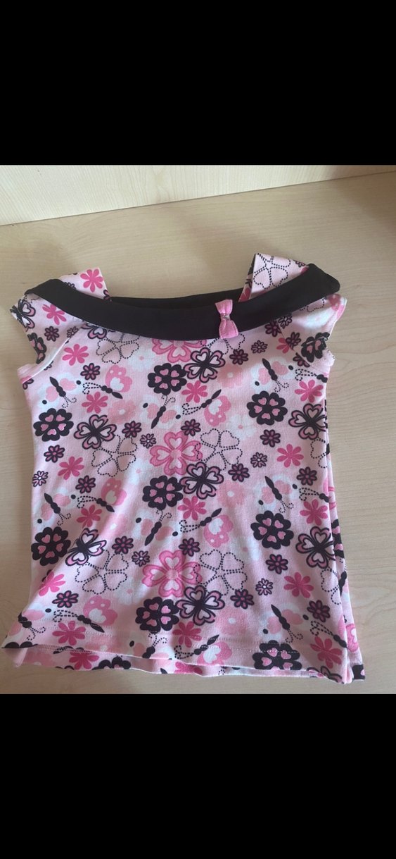 Dantel detaylı, kısa kollu, tekne yaka, pembe çiçek desenli, fitted kız tişörtü. Yumuşak sentetik kumaştan üretilmiştir.