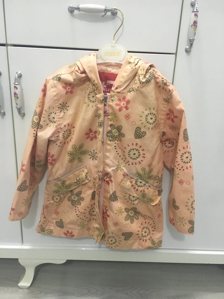 Pembe renkli, çiçek desenli, düğmeli ve notched lapel yakalı bol kesim kız yağmurluğu. Bohem tarzını yansıtır. 2 yaştan 5 yaşa giyidirilebilir