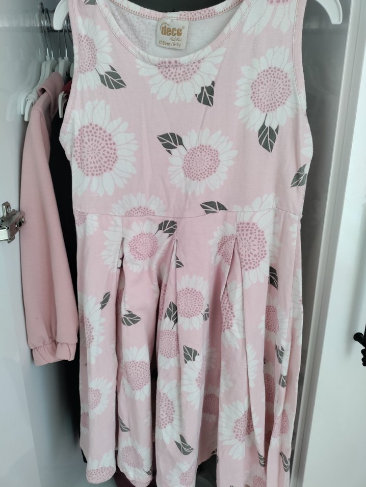 Pembe pastel renkli, kolsuz, çiçek desenli, pilili ve bol kesim kız elbisesi, yumuşak sentetik kumaştan üretilmiştir.