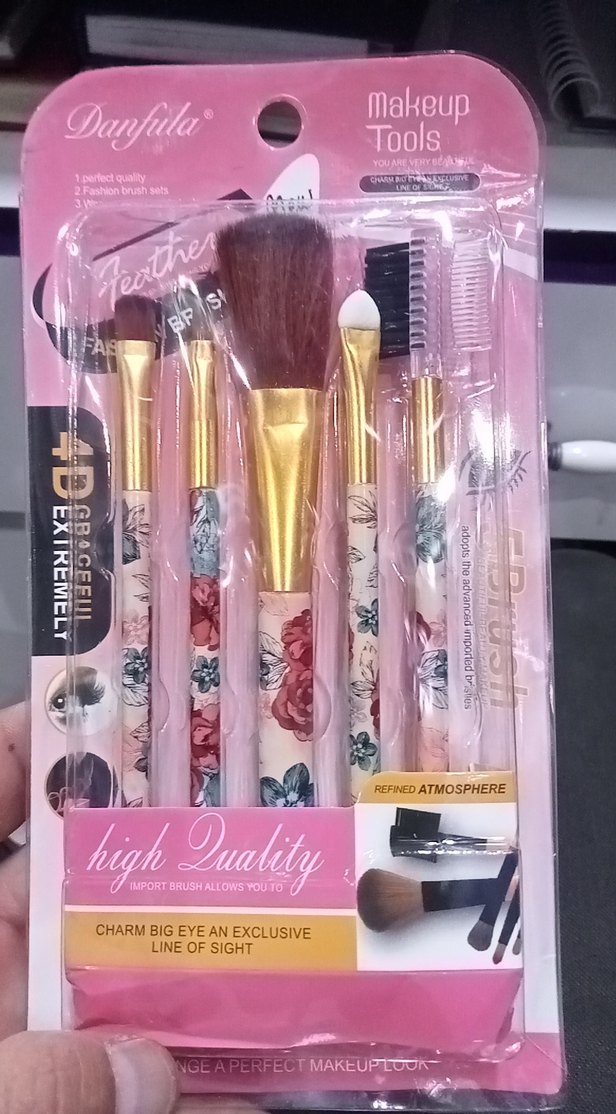 Çiçek desenli saplara sahip açık pembe tonlarında çeşitli makyaj fırçaları içerir. Göz, allık ve kaş fırçaları bulunur. ️
