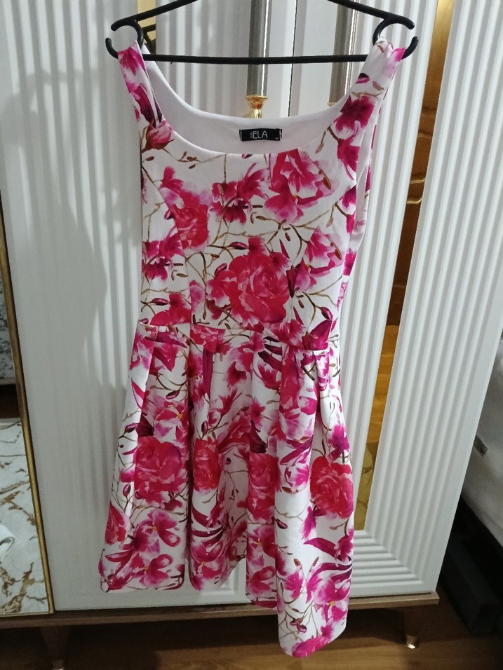 Pembe çiçek desenli, askısız, pileli detaylı, sentetik kumaştan yapılmış, midi boy ve vücuda oturan elbise.