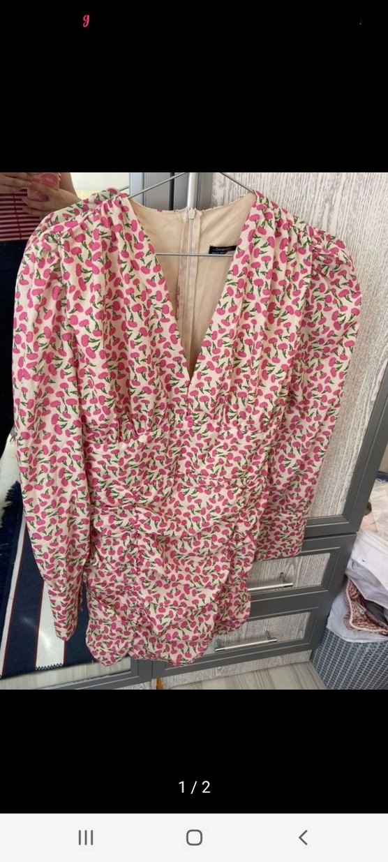 Pembe çiçek desenli, uzun kollu ve vücuda oturan midi uzunlukta Paris sokak modası tarzında kadın elbisesi.