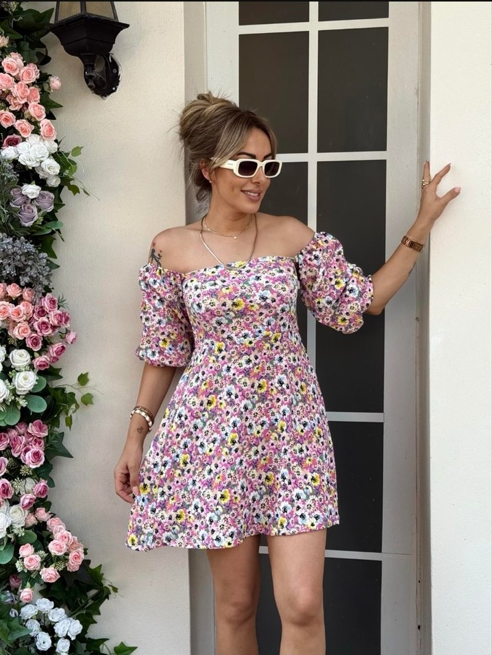 Pembe, pastel çiçek desenli, dantel detaylı, straplez ve askılı kollu bol kesim mini elbise. Bohem tarz için uygun.