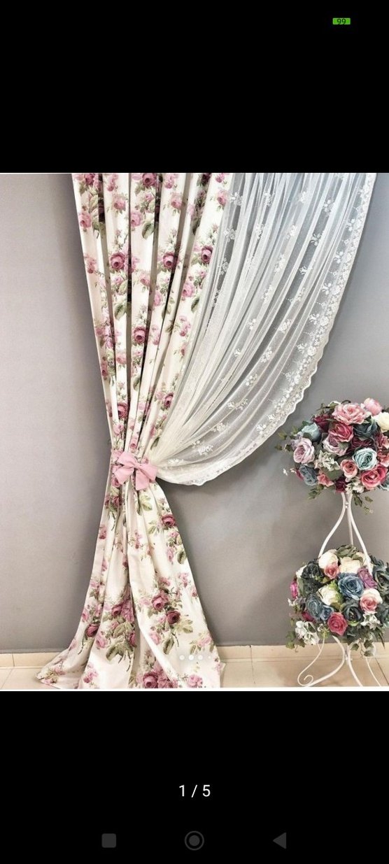 Pastel pembe çiçek desenli, modern klasik tarzda perde. İnce işlemeli tül ve uyumlu pembe bağlama aparatı vardır.
