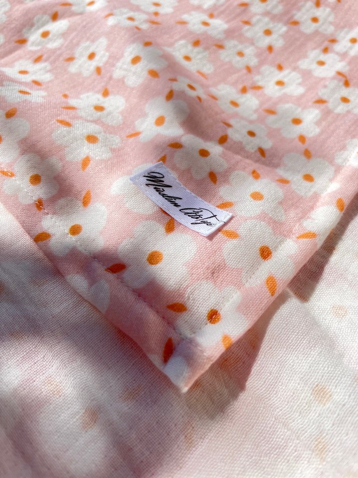 Pastel pembe renkte, beyaz ve turuncu çiçek baskılı yumuşak kumaştan yapılmış bebek örtüsü 70x80 cm