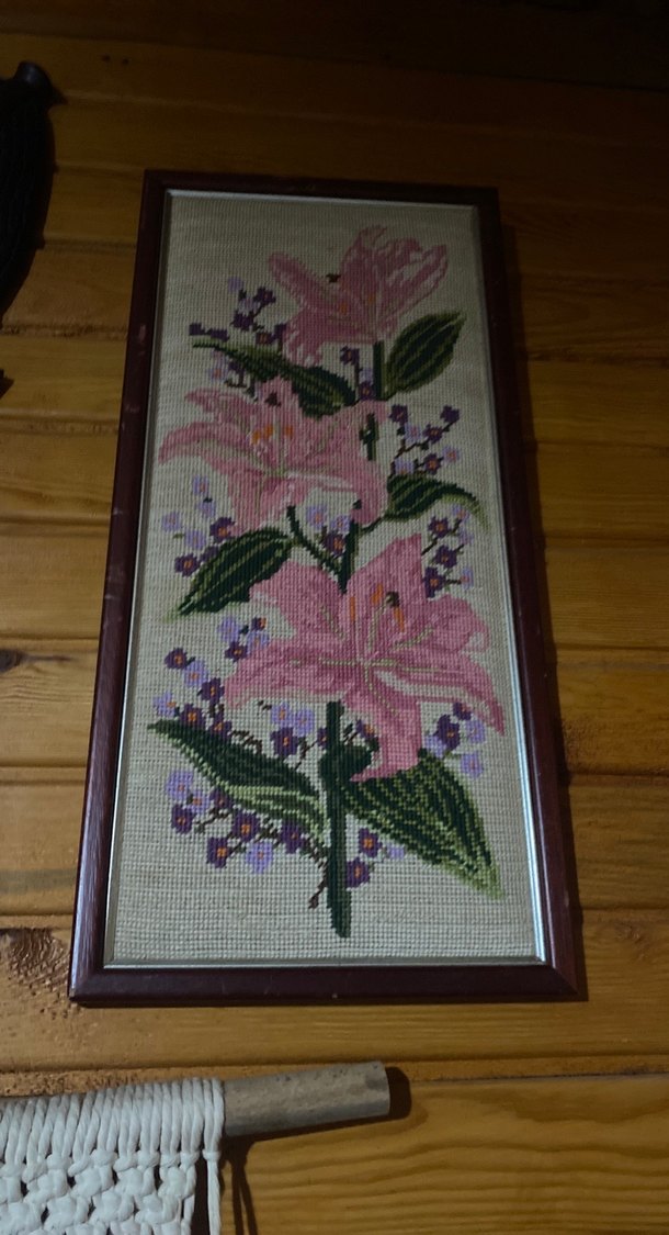 Koyu kahverengi çerçevede, pastel pembe çiçekler ve yeşil yapraklar ile küçük mor detaylar bulunan nakışlı tablo.