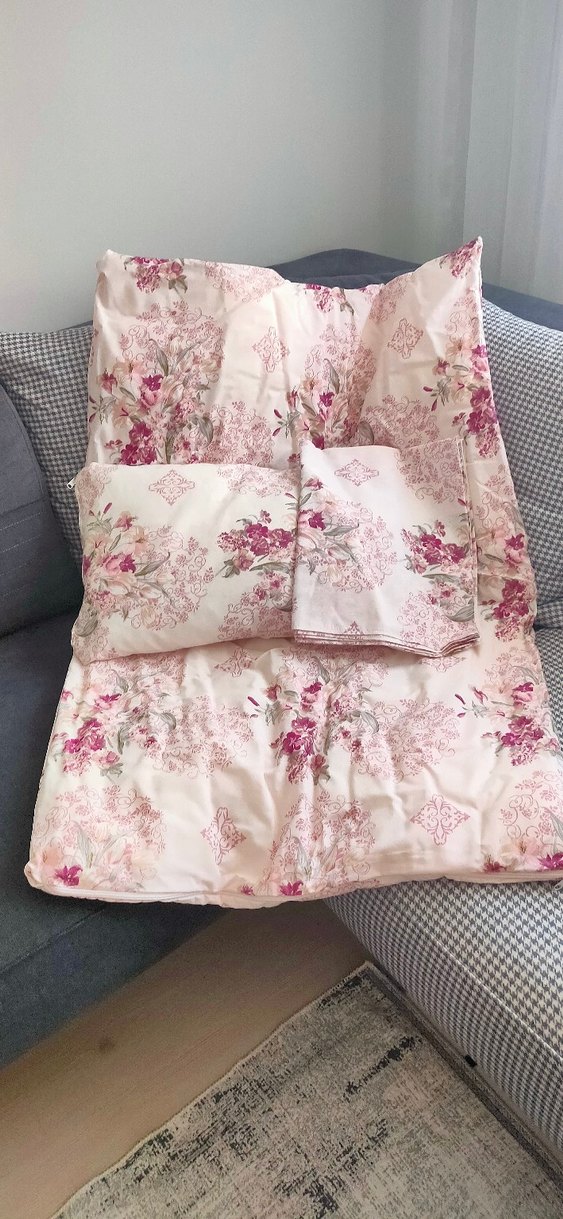 Pembe ve pastel tonlarda çiçek desenli nevresim takımı, yastık ve yorgan yün olup el emeğidir kızıma hediye olarak geldi yenidir hiç kullanılmadı 60x120 ölçülerinde bebek beşik yataklari.ile uyumludur