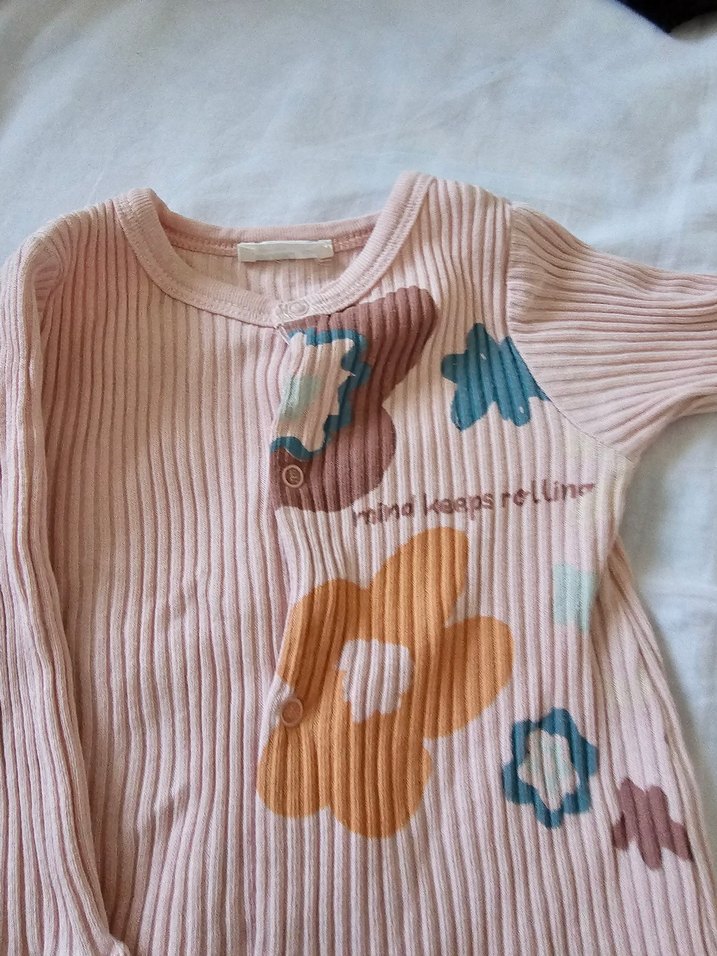 Yumuşak pembe örgü bebek tulumu, pastel çiçek desenleri ve kolay giydirme için çıtçıtlı.alt tarafta bir tane çıt çıt kapanmamakta.yeni bir çıt çıt dikilebilir.