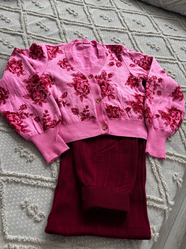 Pembe tonlarında, uzun kollu, bol kesim hırka, kırmızı çiçek desenleriyle örülmüştür. Rahat ve sade bir tarz sunar. İkili takım ayrı almak isterseniz sayfamda var