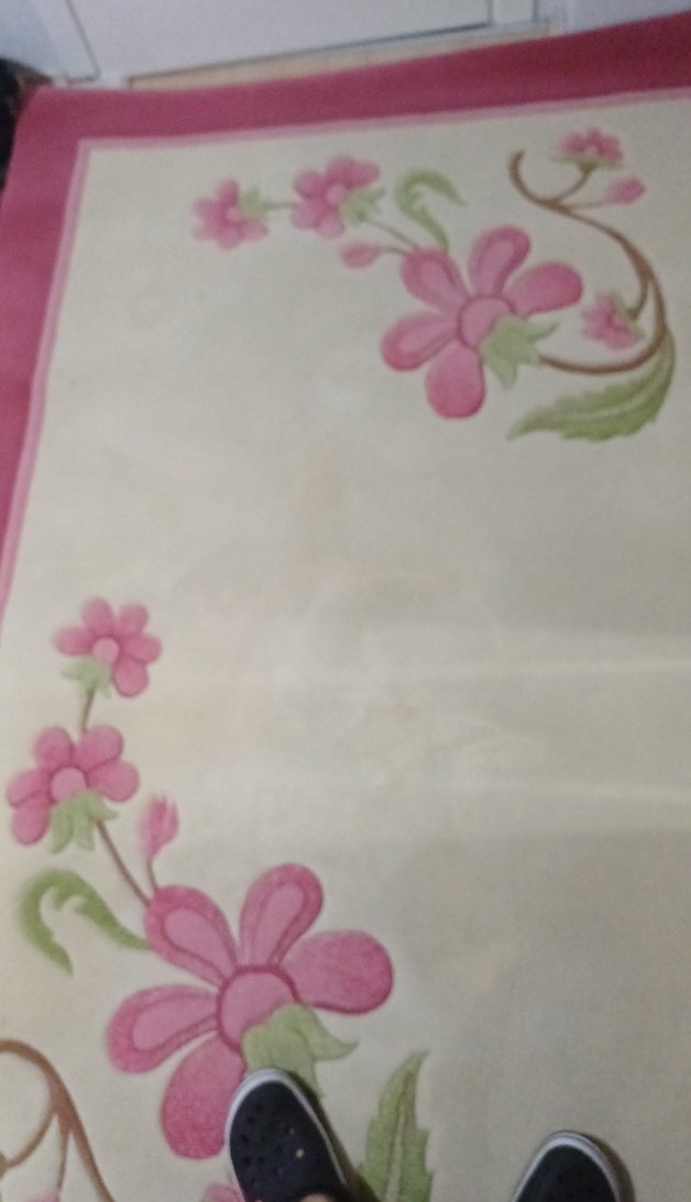 Pastel pembe renkte, çiçek desenli ve klasik stile sahip yumuşak dokulu halı.