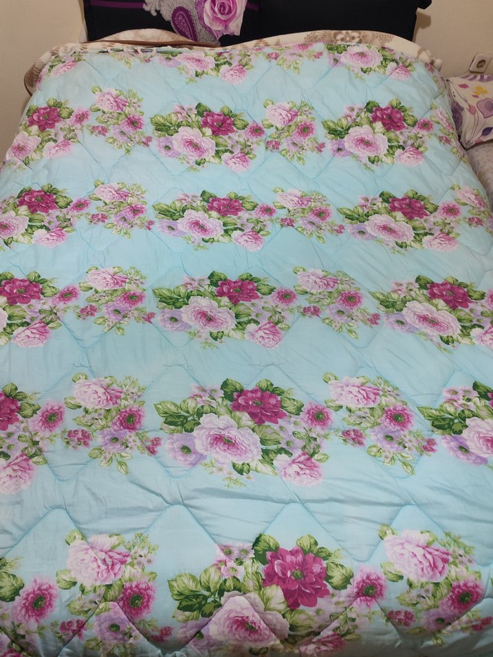 Pastel mavi zemin üzerine pembe çiçek desenleri bulunan, yumuşak kapitone dokulu yorgan