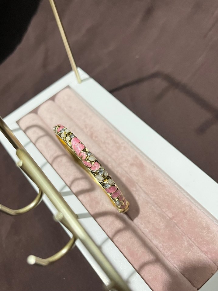 Pastel pembe renkte, çiçek desenli ve payetli bohem tarzda, günlük kullanıma uygun bileklik.