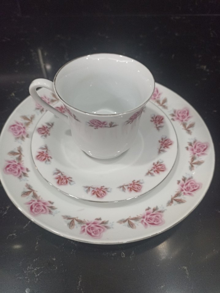 Porselen fincan ve tabaklarda hafif pembe çiçek desenleri bulunan zarif bir fincan takımıdır.