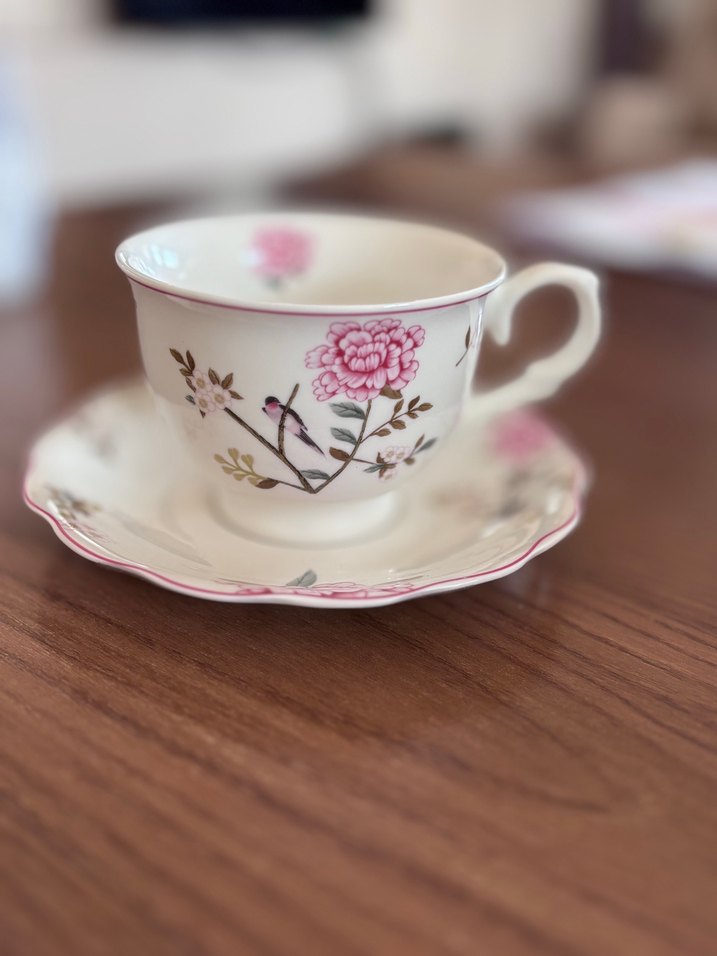 Pembe Çiçek Desenli Porselen Fincan ve Tabak