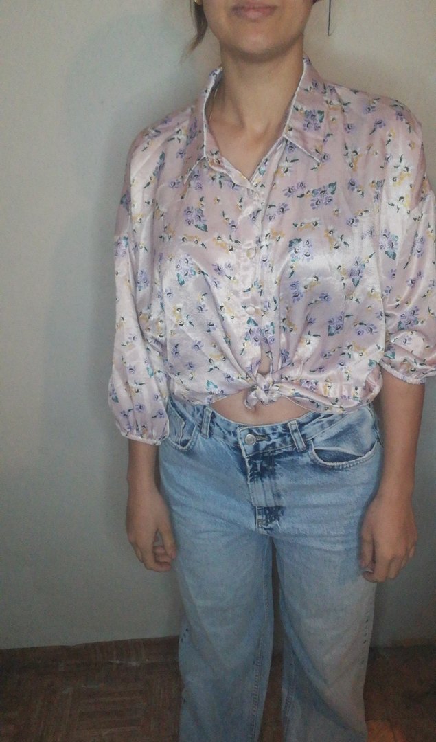 Pembe, rahat kesim, kısa kollu ve yakalı gömlek. Düğmeli ve çiçek desenli, denim kumaştan, günlük kullanıma uygun.