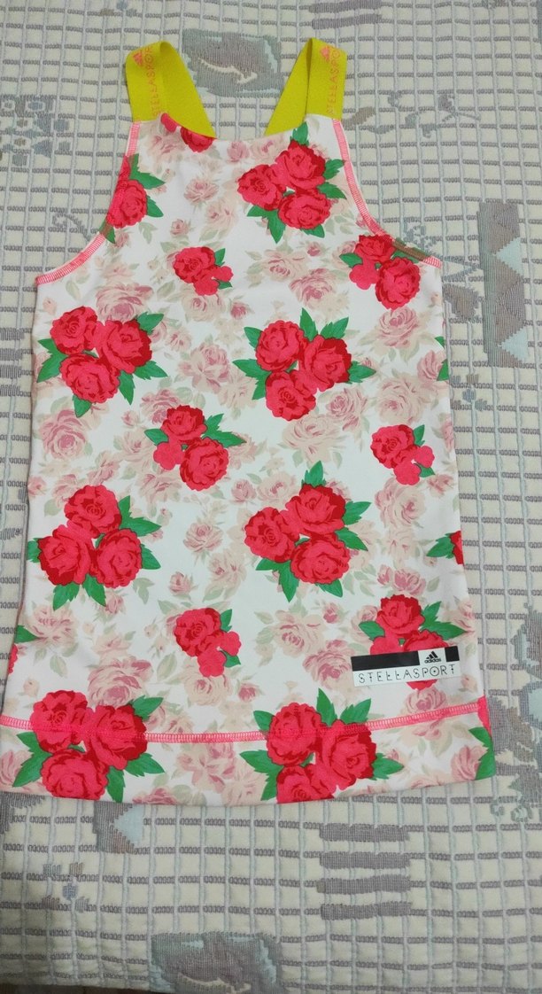 Pastel pembe renkte, canlı kırmızı güllerle baskılı çiçek desenli sporcu atleti. Yumuşak kumaş ve alt kısmında etiket detayı bulunur.