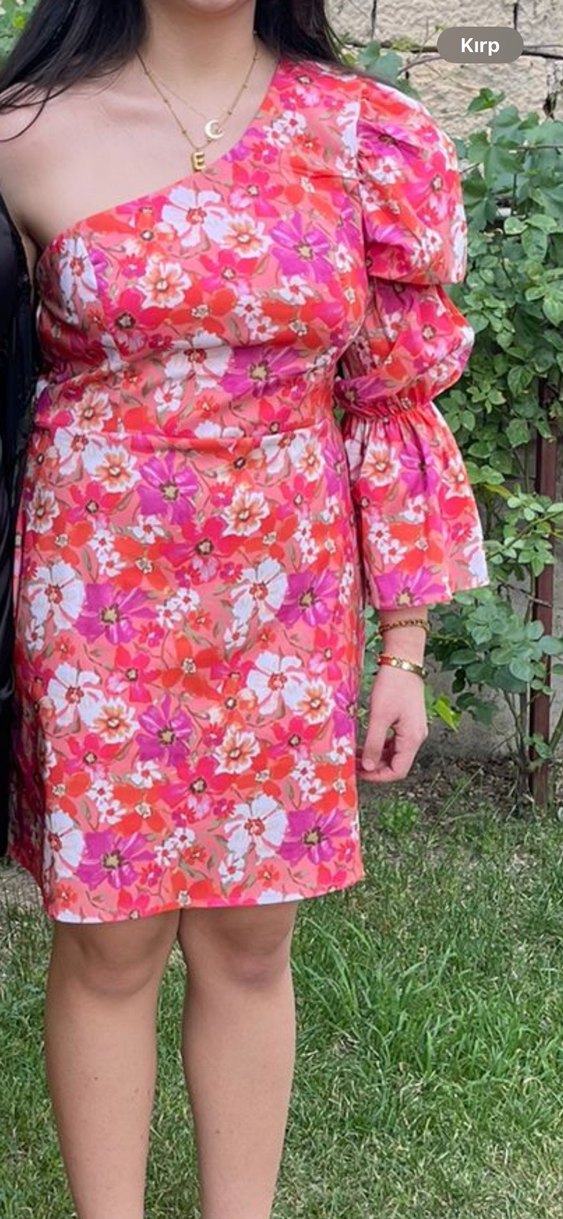 Pembe çiçek desenli, straplez yaka, tek kollu kına düğün elbisesi gece elbisesi