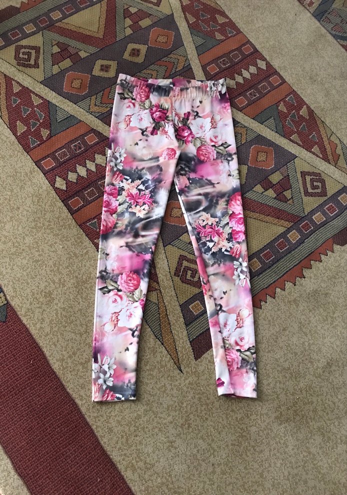 Yumuşak sentetik kumaştan, pastel pembe çiçek desenli, bohem tarzda tayt pantolon