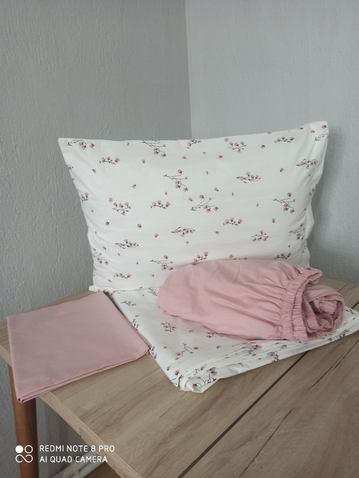 Pastel pembe çiçek desenli nevresim takımı, yumuşak kumaştan yastık kılıfı, lastikli çarşaf ve düz çarşaf içerir.