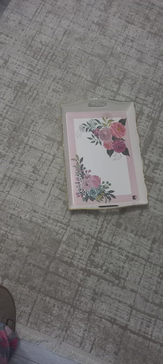 Pembe renkte, pastel çiçek desenli ve klasik tarzda kenarlara sahip, tutma kulplu tepsi. #tepsi#büyüktepsi