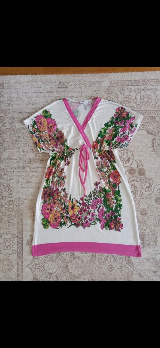 Renkli çiçek desenli, kısa kollu, V yakalı ve drapeli bol kesim tunik. Kısa boyu ve pembe detaylarıyla canlı bohem tarz sunar.