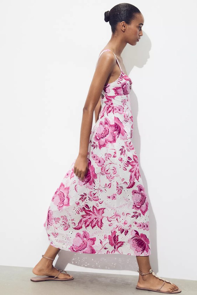 Pembe Çiçek Desenli Uzun Askısız Elbise