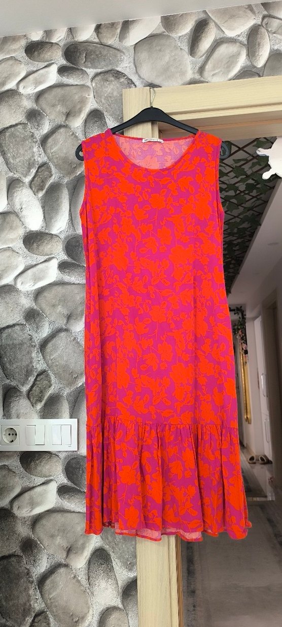 Pembe çiçek desenli, uzun ve kolsuz bohem tarzda, yumuşak kumaştan yapılmış bol kesim elbise. Rahat ve dökümlü bir görünüme sahiptir. Ayrıca iki yanda cepleri mevcut
