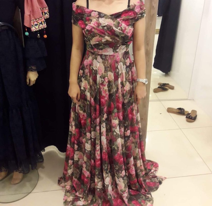 Pembe Çiçek Desenli Uzun Drapeli Elbise
