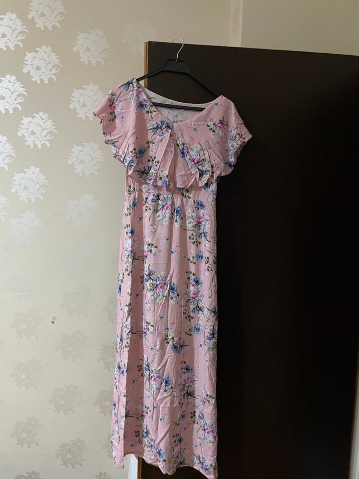 Rahat kesim, uzun boy pembe çiçek desenli elbise Fırfırlı yaka ve kolsuz tasarım, konfor sağlar.