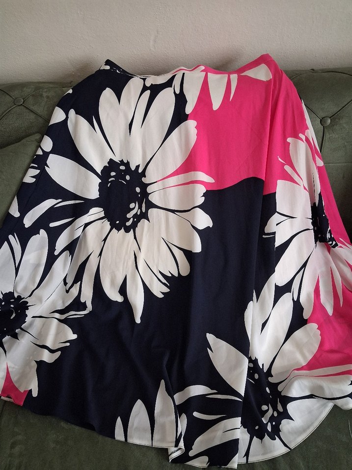 Pembe renkli, büyük çiçek desenli, bol kesim ve drapeli uzun hamile eteği. Sentetik kumaştan, bohem ve retro tarzda, günlük kullanıma uygun.