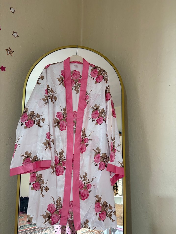 Pembe çiçek desenli, uzun boy, bol kesim, bohem vintage tarzda kadın sabahlık İnce askılı kollara sahiptir.