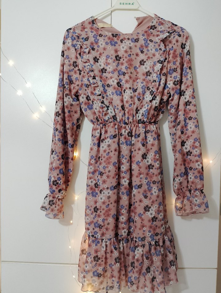 Uzun, bol kesim elbise, çiçek desenli ve fırfır detaylıdır. V yaka ve uzun kolludur, yumuşak sentetik kumaştan yapılmıştır.kumaşı rahat olduğu için serin tutar.