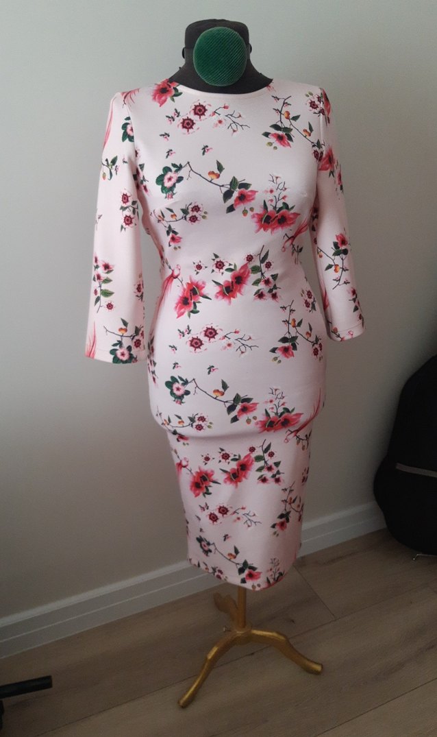 Uzun kollu, pembe pastel tonlarda çiçek desenli kalem elbise. Yuvarlak yakalı ve drapeli, modern bir tasarım. Elbise mankenimden dolayı tuhaf duruyor esnek streç bir elbise