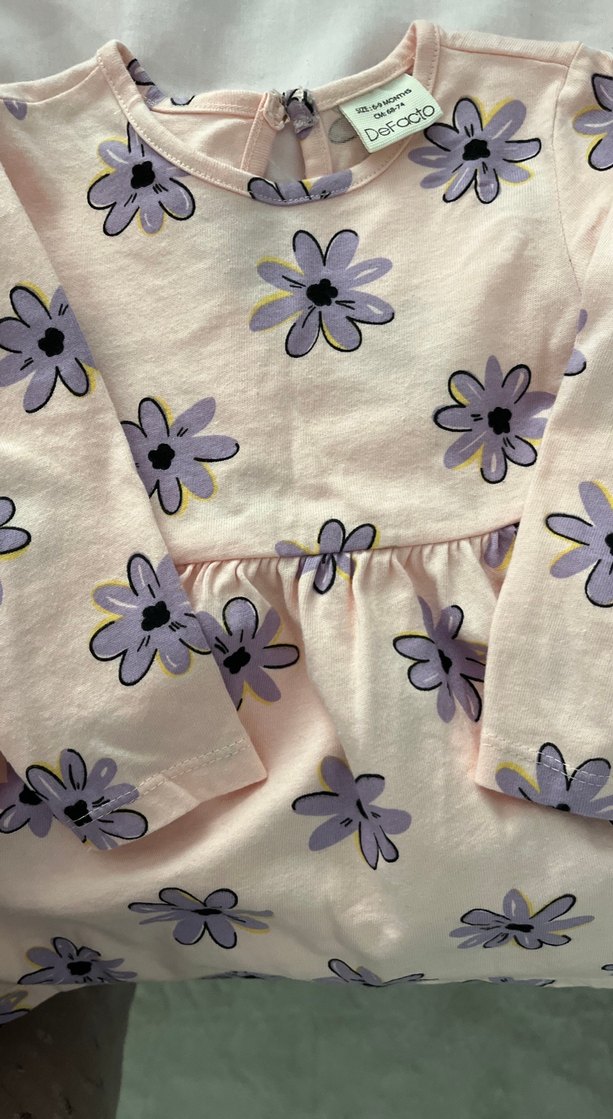 Pastel pembe renkli, uzun kollu, yuvarlak yaka kız elbisesi. Mor çiçek desenleri ve fırfır detayları bulunur. Rahat kesim, yumuşak sentetik kumaş.