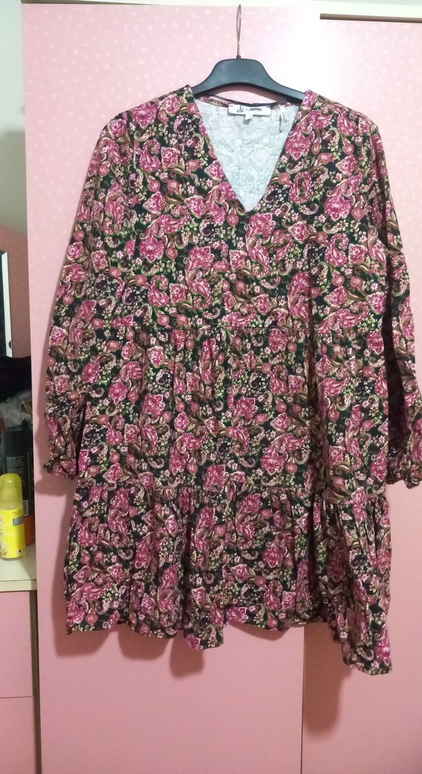 Bu bol kesim bohem tunik, koyu pembe çiçek desenli batik, uzun kollu, V yakalı ve fırfır detaylıdır. bazan kumaştan yapılmıştır, kısa boydadır ve günlük kullanıma uygundur.