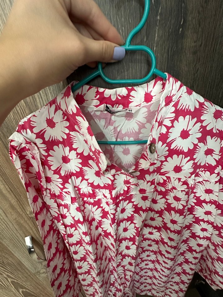 Yumuşak pamuktan, bol kesim, pembe-beyaz çiçek desenli, V yaka ve düğmeli uzun kollu gömlek.