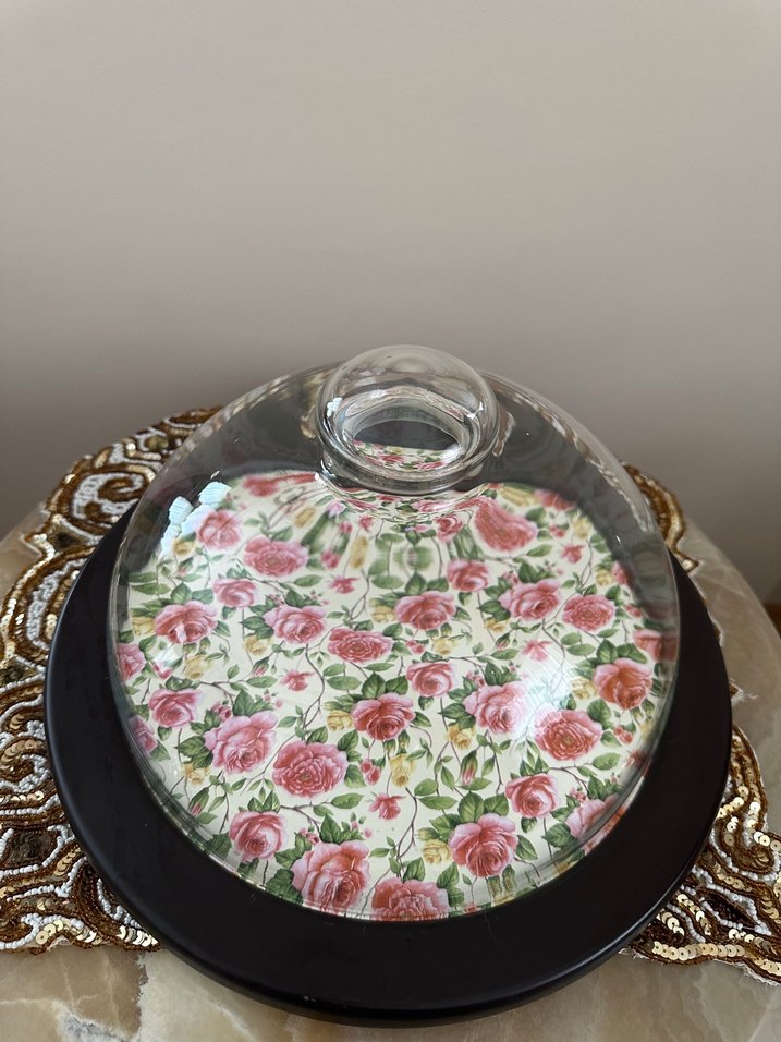 Pembe Çiçek Desenli Vintage Kek Fanusu