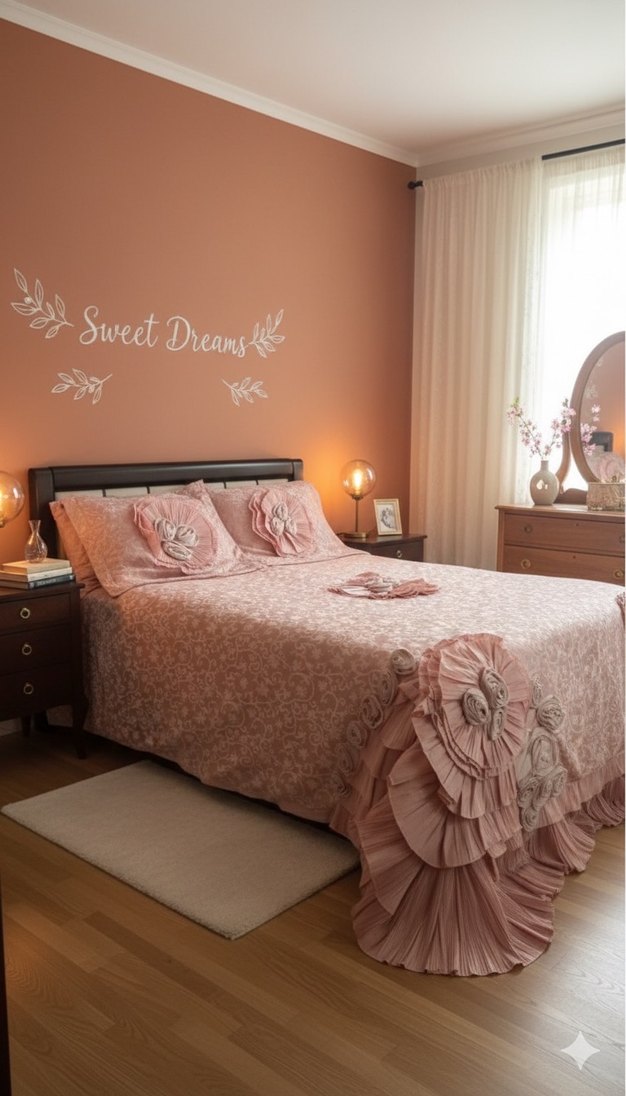 Pembe pastel çiçek desenli yatak örtüsü, yastıklarda ve kenarlarda fırfır detaylarıyla süslenmiştir. Yumuşak ve şık tasarım.