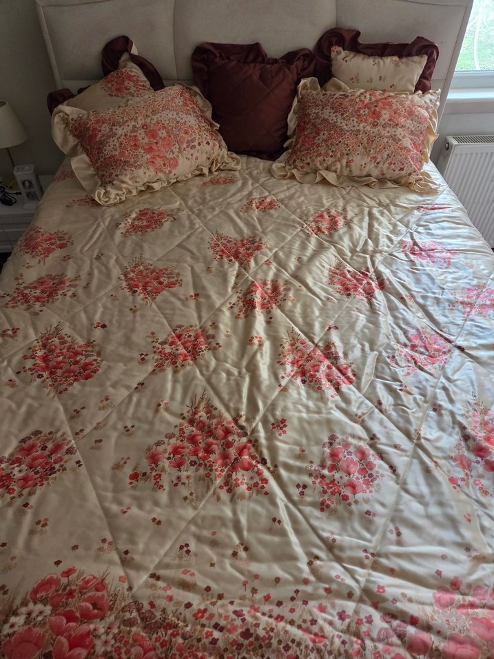 Pembe pastel tonlarında çiçek desenli, yumuşak dokulu yatak örtüsü ve uyumlu yastıklarla şık bir görünüm sağlar.