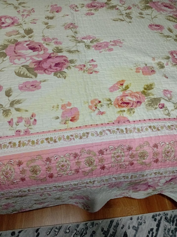 Pastel pembe çiçek desenine sahip bu yatak örtüsü, yatak odasına yumuşak ve rahat bir hava katıyor. bir tarafında ütüden kaynaklı sarartı oldu resimde gösterdim