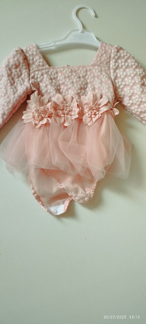 Uzun kollu, V yaka pembe elbise, çiçek nakışı ve tül fırfır detaylarıyla bohem bir tarz sunar.