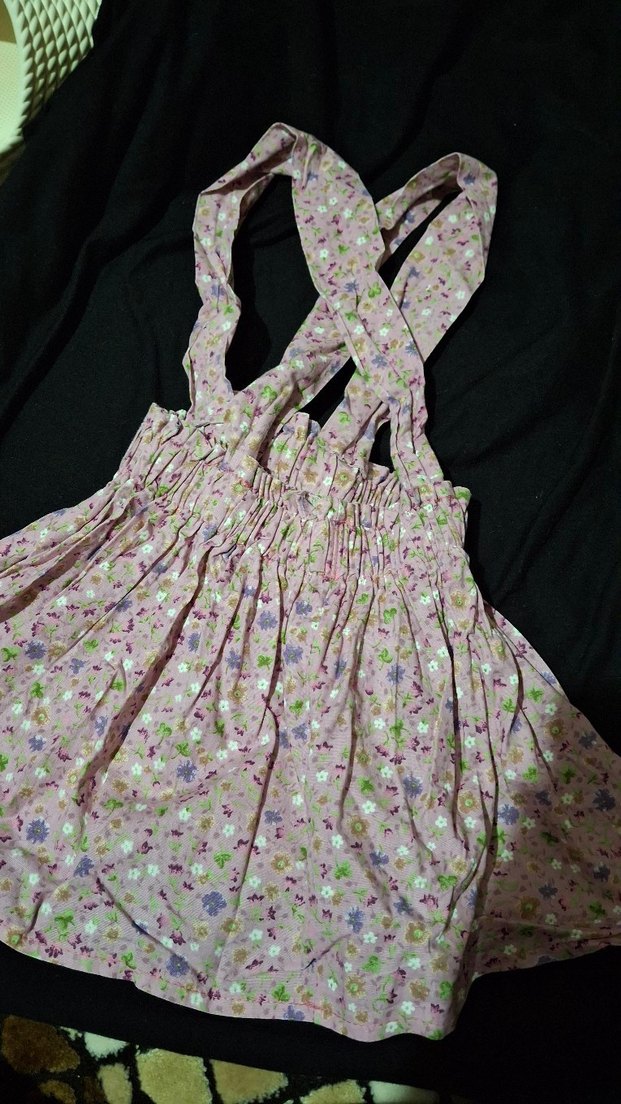Pembe çiçekli, pileli ve askılı etek , bol kesimi ve yumuşak sentetik kumaşıyla çok rahat.