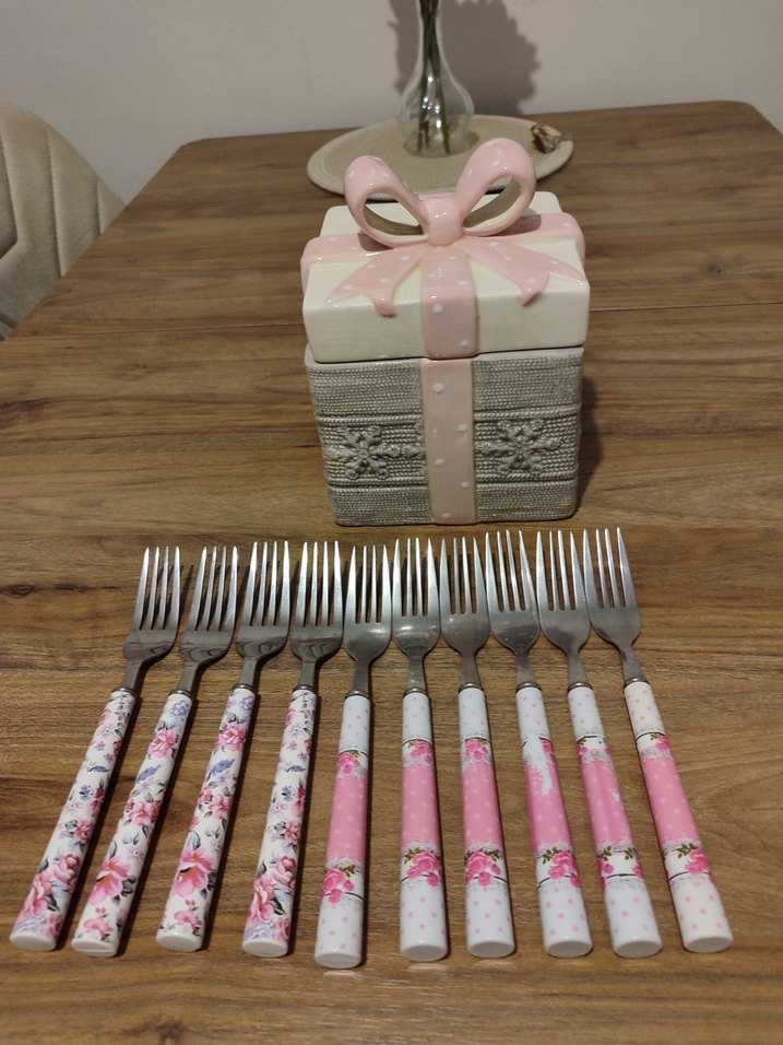 Çiçek desenli pastel pembe saplara sahip 10'lu tatlı çatalı seti, tatlı servisi için uygundur. marka temsilidir