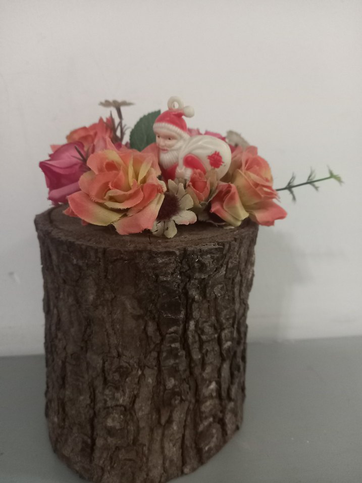 Pembe yapay çiçekler ve küçük bir Noel Baba figürüyle süslenmiş dekoratif ahşap kütük, ortama şık ve renkli bir hava katar.